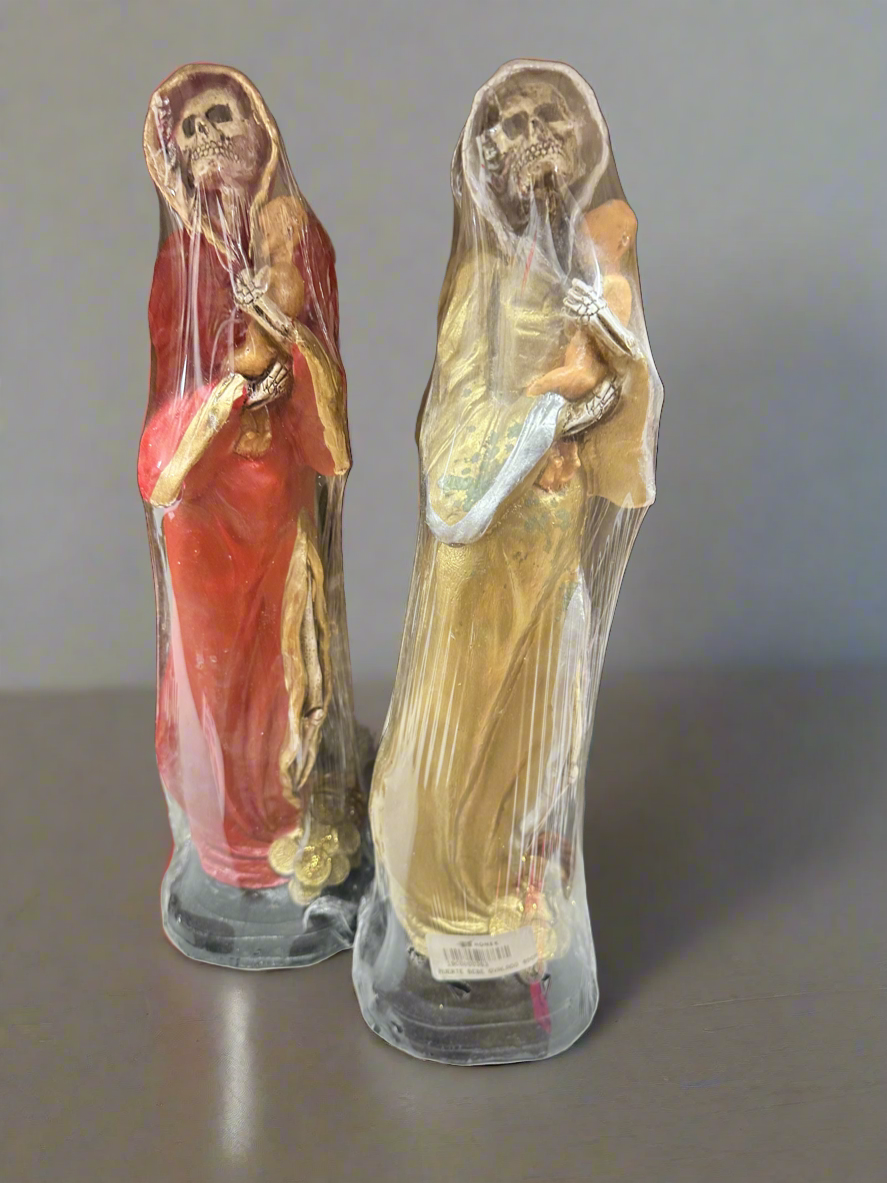 This Santa Muerte figurine portrays the deity as a motherly figure, holding a baby for protection during pregnancy. Its presence can bring a sense of comfort and security to expecting mothers. Made with careful attention to detail, it serves as a symbolic representation of maternal strength and protection.